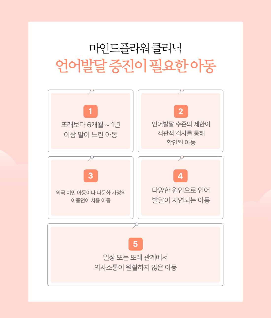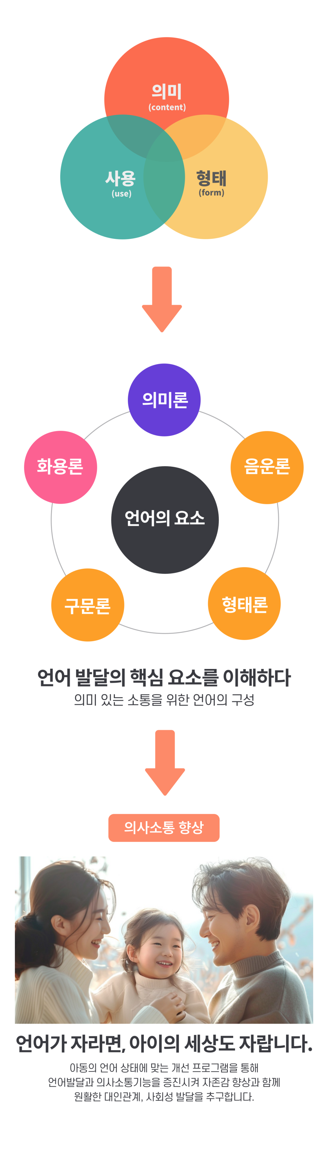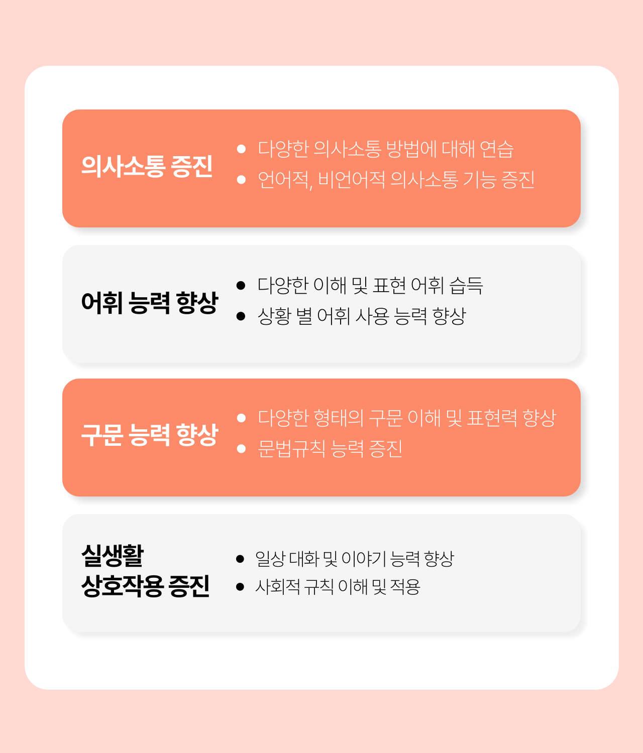 언어발달 지연이나 의사소통의 어려움을 겪는 아동들의 언어 능력 발달을 돕는 교육 및 개선 프로그램입니다. 언어 이해 및 표현, 상호작용 등과 같은 의사소통 능력 향상을 목표로 다양한 영역을 다룹니다.